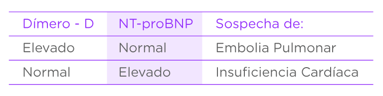 -Realizar la cuantificación de los biomarcadores Dímero D y NT-proBNP, en conjunto, permite distinguir entre un diagnóstico de Embolia pulmonar e Insuficiencia Cardíaca:
